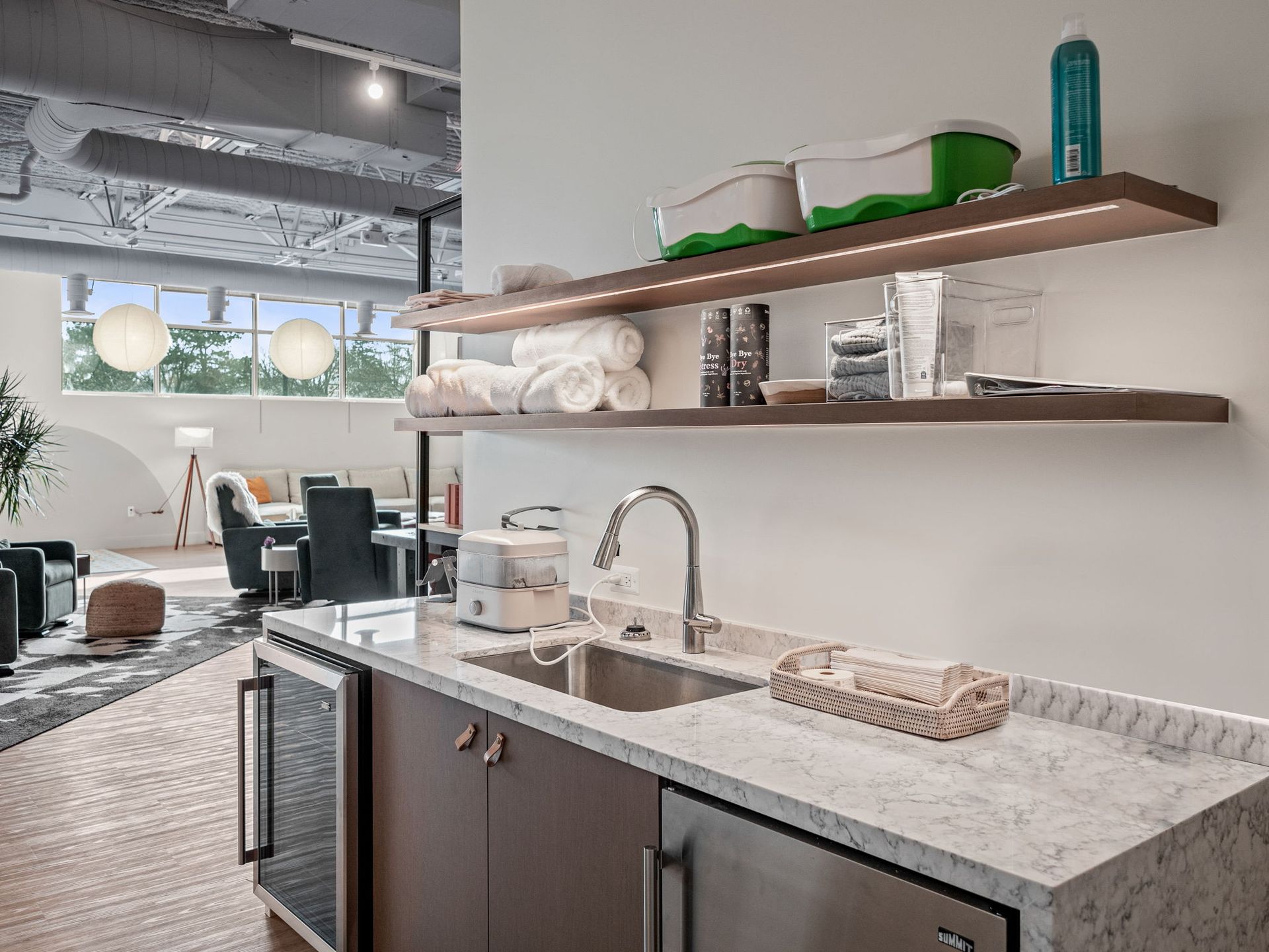 A top-of-the-line personal care/ shower area, large group yoga class, and a calming share and relax area that is accompanied by a warm fireplace. This new space also offers food options with a newly redone kitchen and a food & nutrition area.