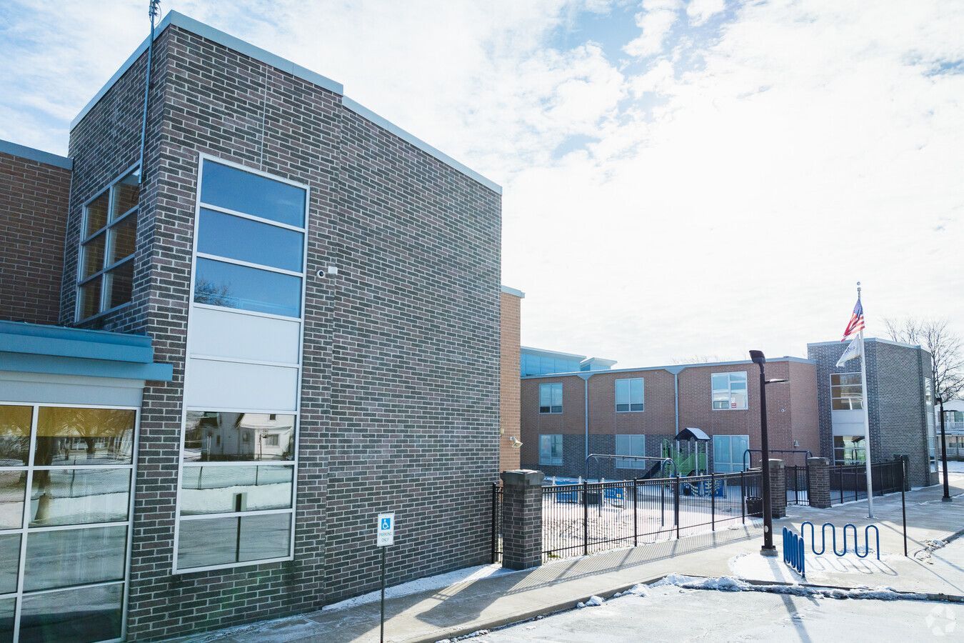 Spanning 45,000 square feet, the captivating two-story structure has an open courtyard nestled amidst the parallel streets. The architectural design showcases a dual-level corridor bridge connecting the North and South wings, facilitating abundant natural light flow into the school's core through expansive courtyard windows. The bridge offers views of the gymnasium and student dining area, bypassing large interior spaces. It intersects with two-story space sat various points, including junctures, corners, and stair towers.