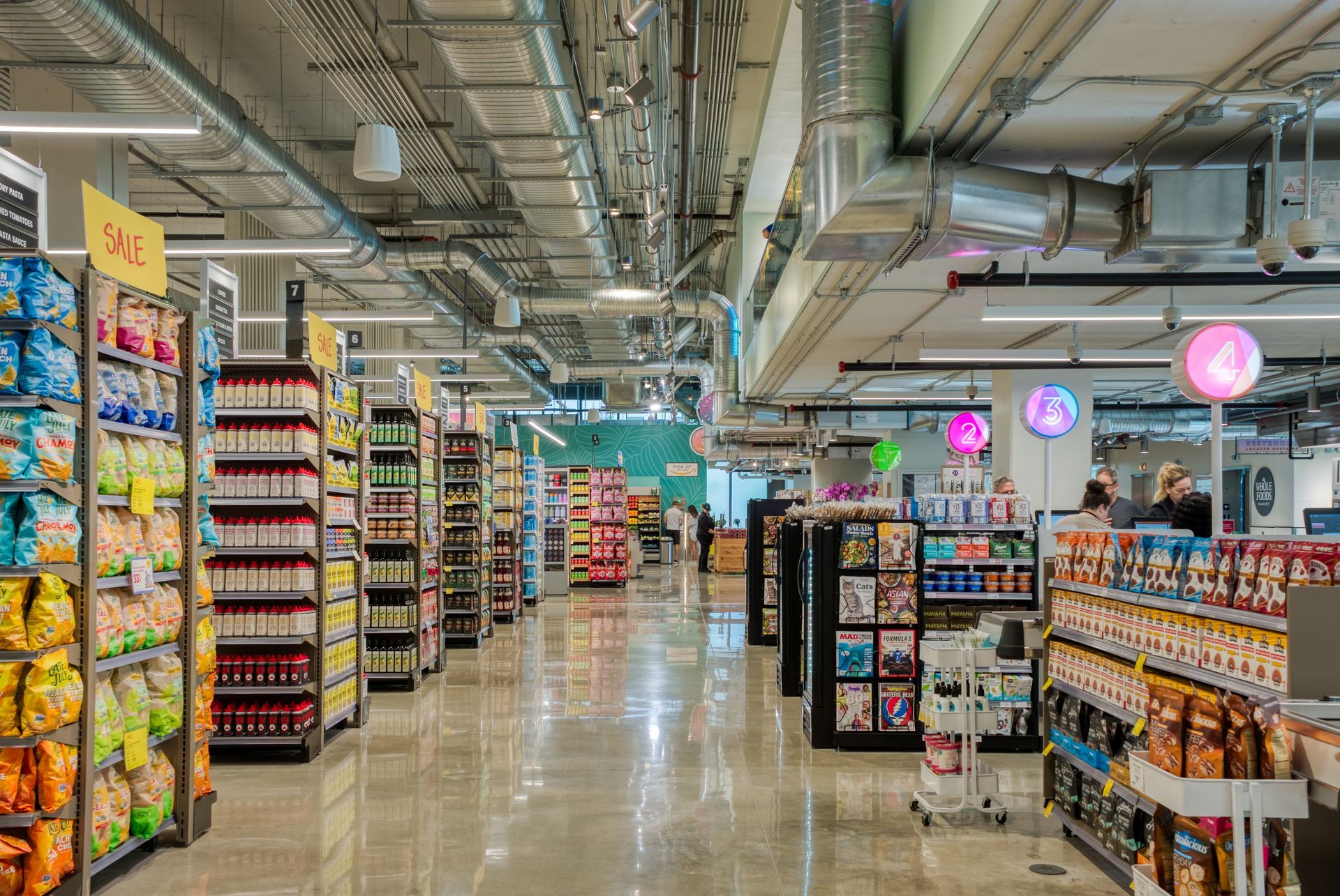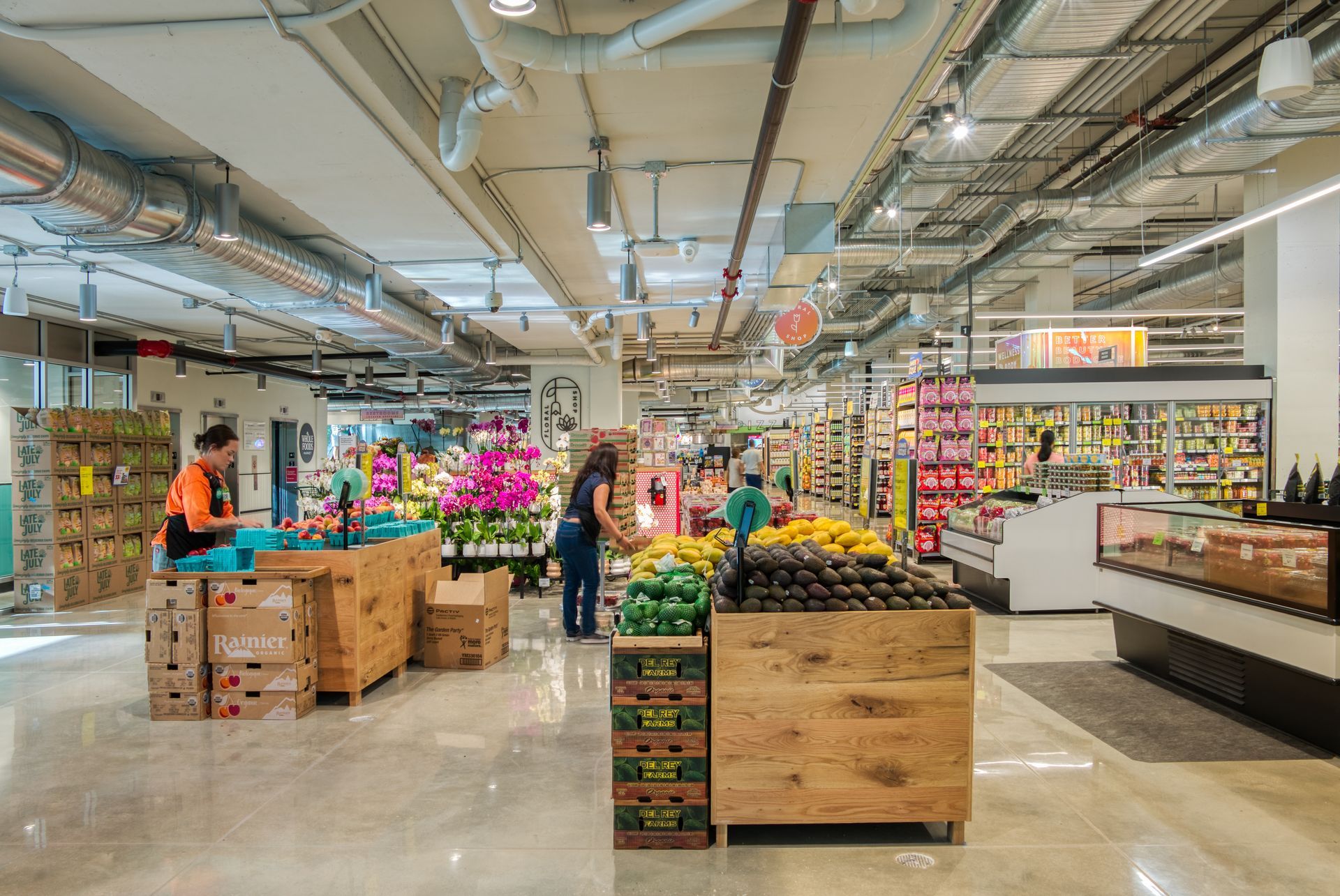 The interior build-out included metal stud framing, premium finishes, toilet rooms, offices, breakrooms, and customer-facing areas. Back-of-house work featured a receiving department, stockroom, prep kitchens, and installation of coolers, freezers, and grocery equipment.